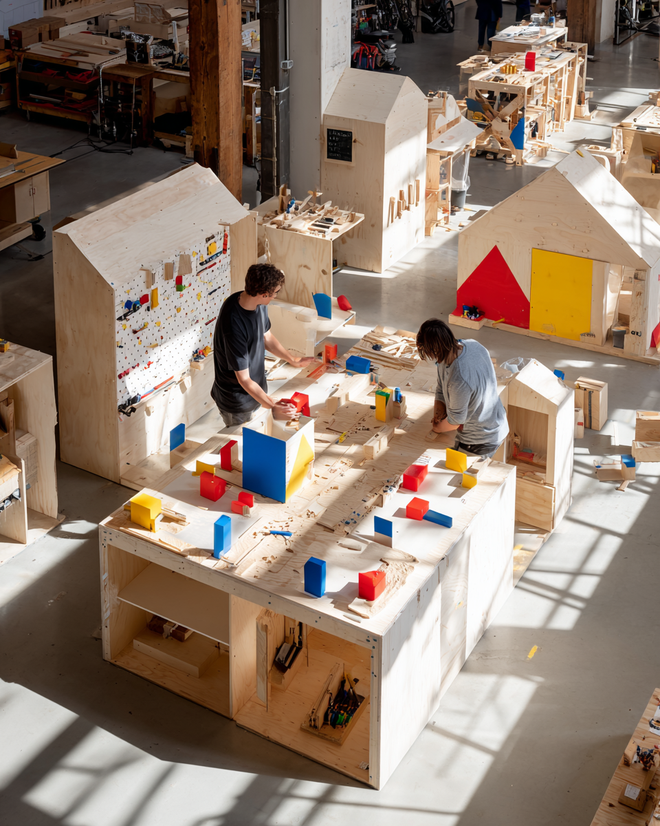 Behind the scenes, create a flexible making ecosystem: research labs, tool-safe maker studios, and digital fabrication (CNC, laser, robotics) organized around a double-height assembly hall with crane access for 1:1 prototyping. Support spaces—offices, loading, timber storage—connect to outdoor yards, green infrastructure, and trail links, with a covered prototype canopy and outdoor classrooms.
