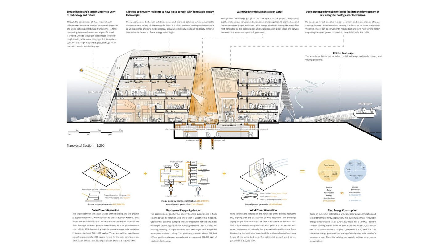 The facility aims to not only drive technological advancements but also to demonstrate and educate the public about sustainable energy solutions. It will feature interactive exhibits, educational programs, and community outreach initiatives to engage visitors and promote awareness. Architecturally, the building should be a symbol of progress, reflecting the natural beauty of Iceland's landscapes—such as its volcanic formations, glaciers, and coastal vistas.